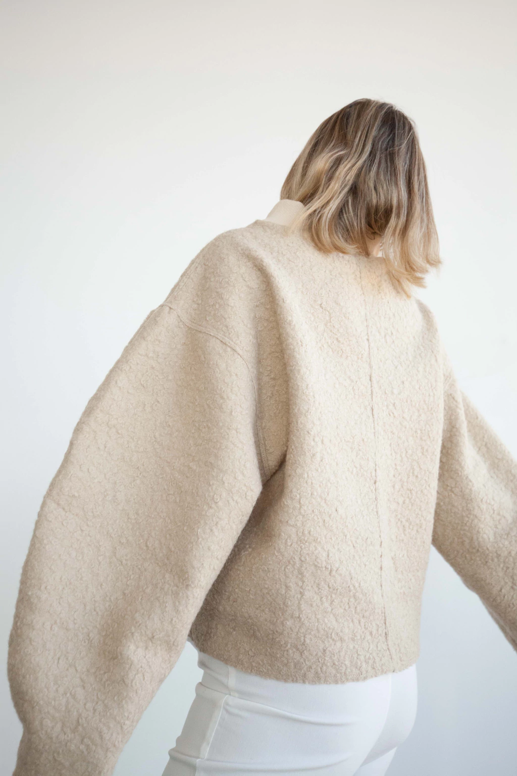 Confeccionado en bouclé premium, de textura esponjosa y liviana, tiene un fit amplio y relajado, cuello alto de ribb y mangas súper amplias que lo convierten en un básico elevado para tu día a día. Ideal para usar con pantalones al cuerpo, leggings o incluso durante el embarazo, gracias a su corte suelto que acompaña el cuerpo sin ajustar.